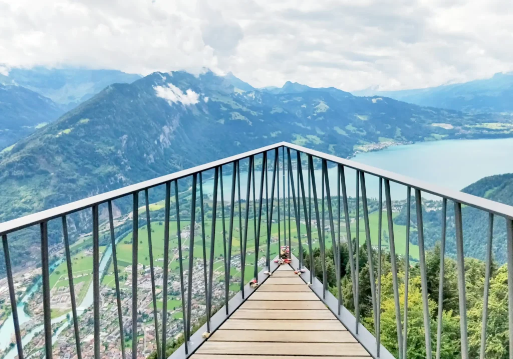 Panorama-Restaurant und historischer Aussichtsturm mit Blick auf die Berner Oberländer Berge und die einmaligen Seen von Interlaken.